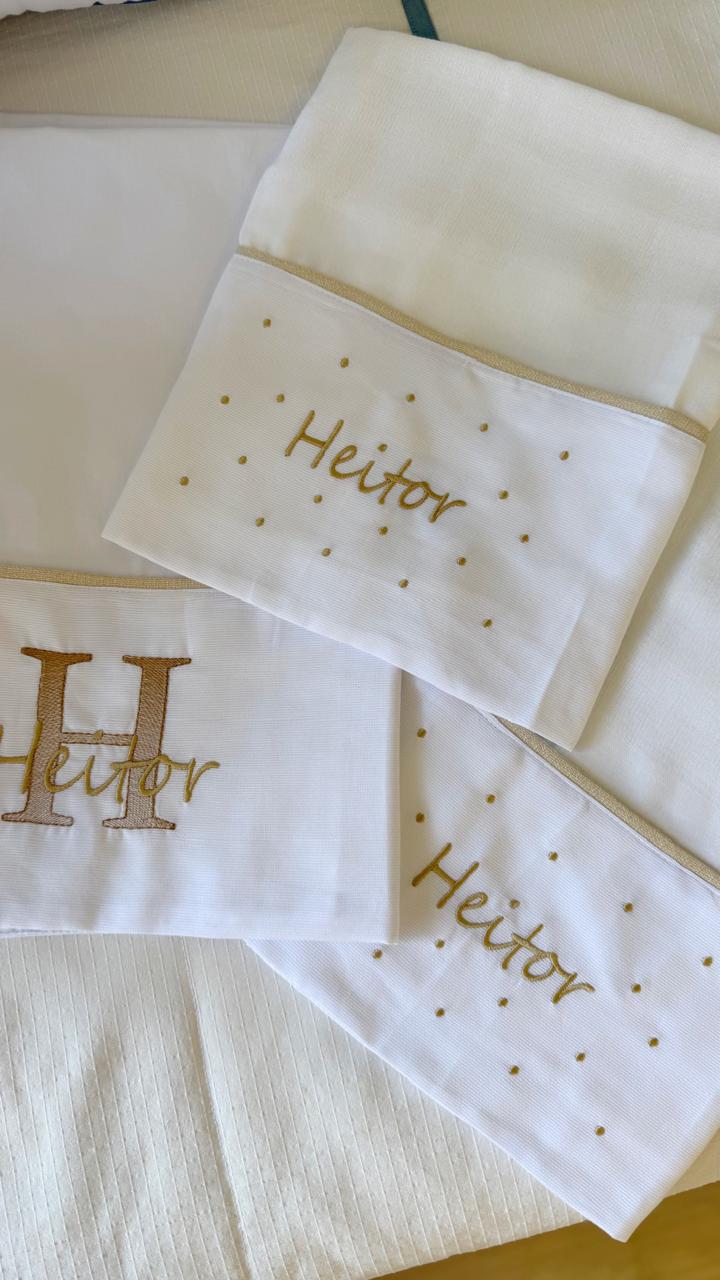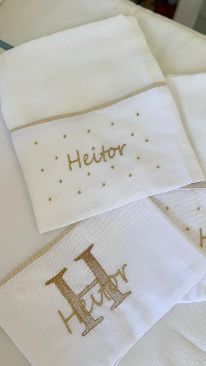 O nosso kit, feito de forma personalizada, acompanha 3 fraldas de ombro ( Cremer) , 1 cueiro ( percal 230 fios) , 1 toalha fralda ( cremer) e 1 saquinho organizador .