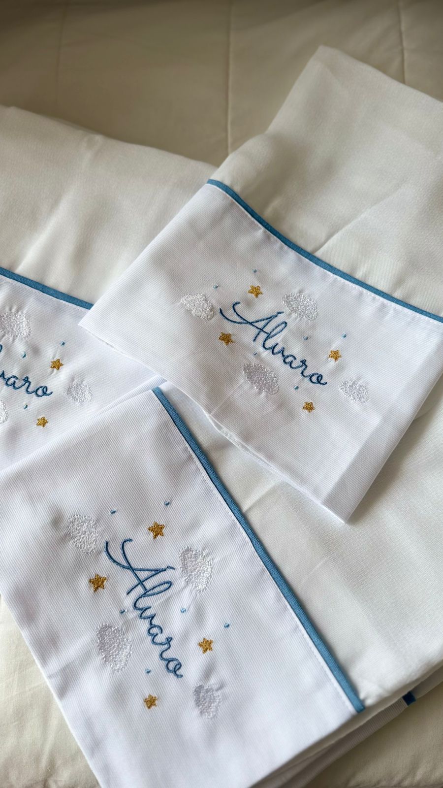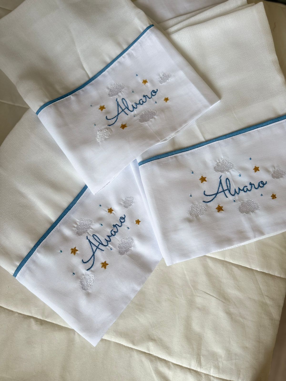O nosso kit, feito de forma personalizada, acompanha 3 fraldas de ombro ( Cremer) , 1 cueiro ( percal 230 fios) , 1 toalha fralda ( cremer) e 1 saquinho organizador .