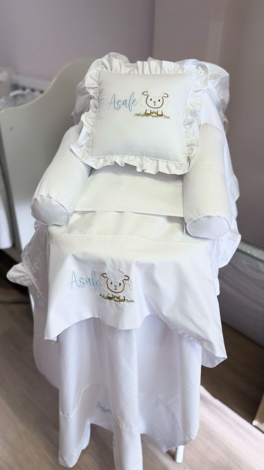 Nossos kits maternidade são fabricados em algodão hipoalergênicos 230 fios e acompanham quatro peças ( manta, cueiro, rolo segura bebê e travesseiro)